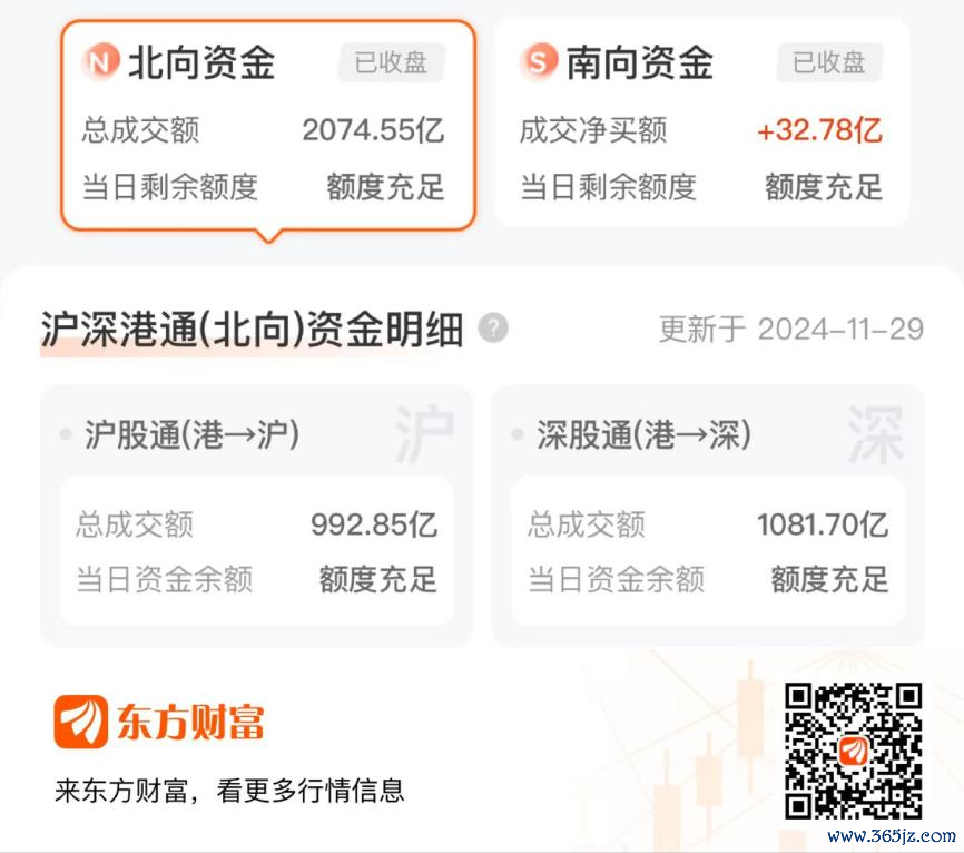11月29日,两市强势反弹,沪指收涨近1%,创指涨超2%。北向资金当日成交2074.55亿元,占沪深两市总成交额的12.14%。