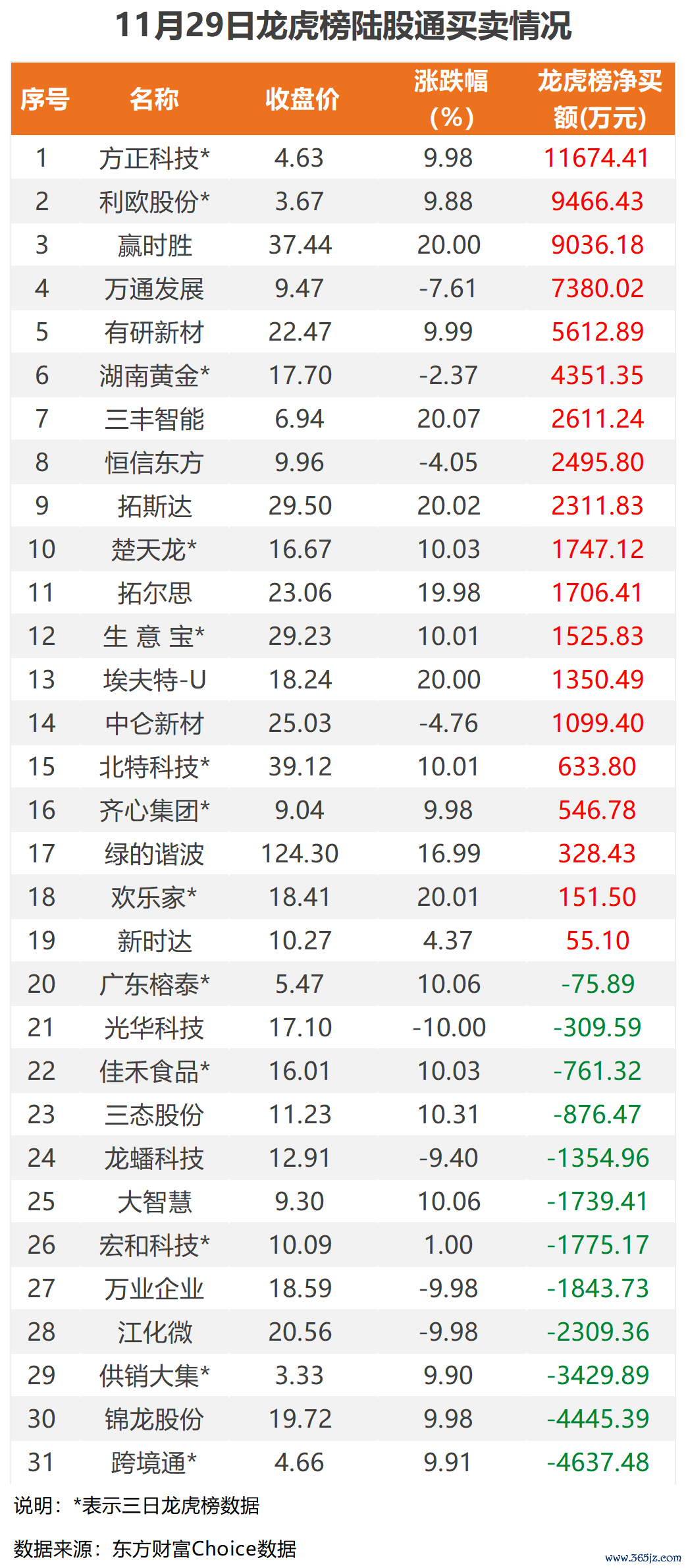 今日陆股通参与龙虎榜中个股共涉及31股,其中19股被陆股通净买入,方正科技被买入最多,三日净买入约1.17亿元;另外12股被陆股通净卖出,跨境通被卖出最多,三日净卖出4637.48万元。