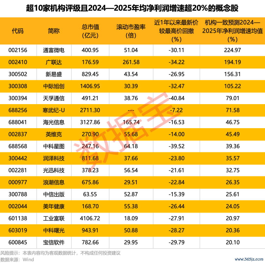 据数据宝统计,机构最新给予评级报告超过10家且一致性预测2024—2025年均净利润增速超过20%的概念股有17只,其中通富微电以224.97%的增速,排名第一;其次的广联达、新易盛、中际旭创年均增速也超过了100%。