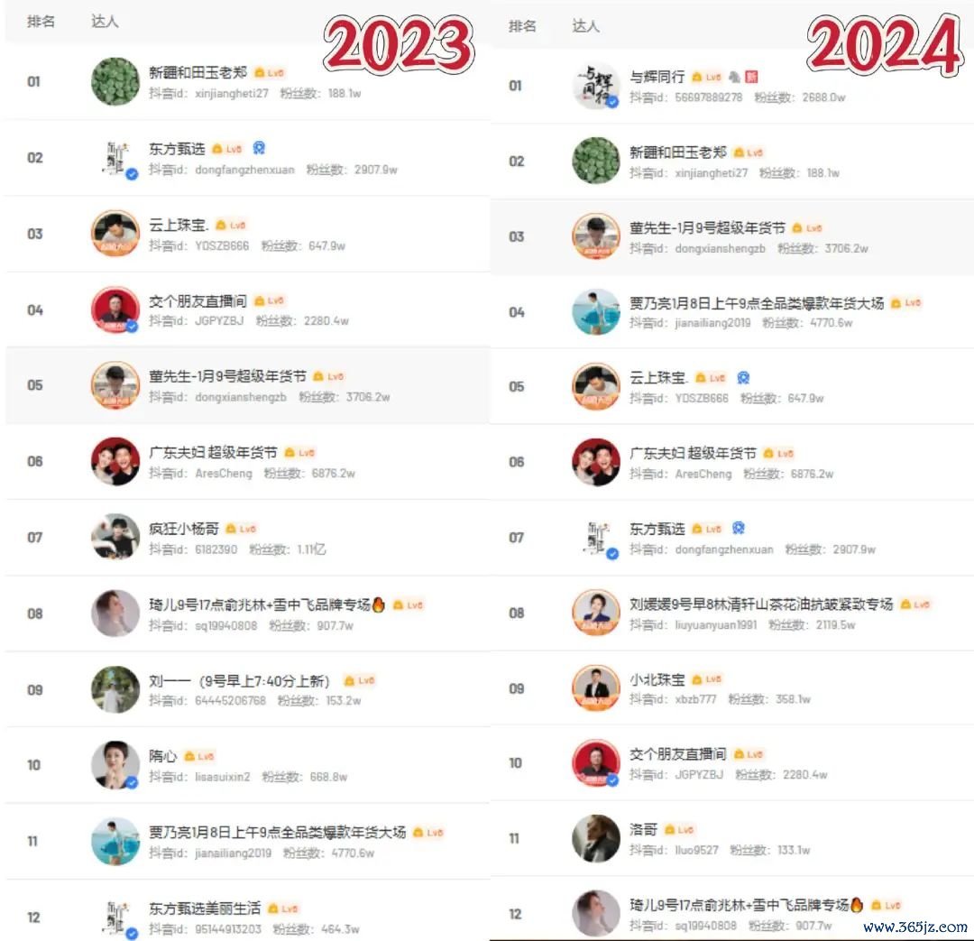 除了异军突起的与辉同行直播间,过去一年抖音头部主播的格局变化不大,黑马后劲不足,多是老面孔之间的位次轮换。